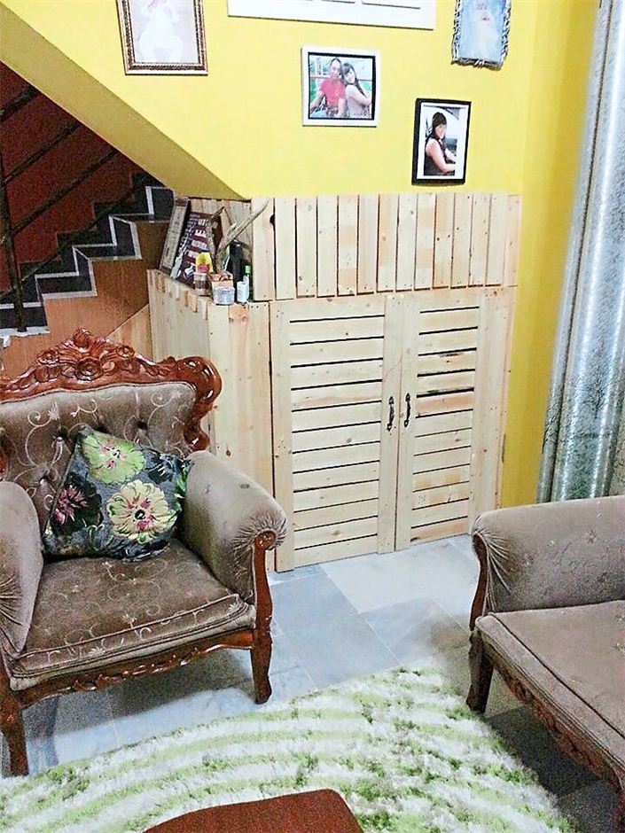 Wooden pallets are used to create a small cup – board to store items under the stairs.