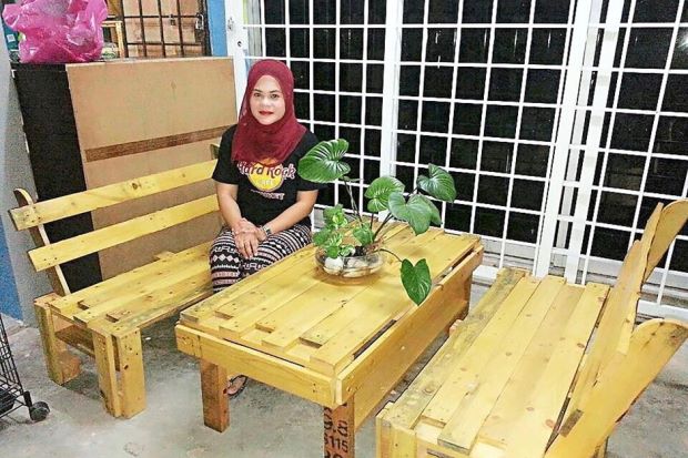 Marini with a coffee table and benches made of wooden pallets at her home in Seremban.