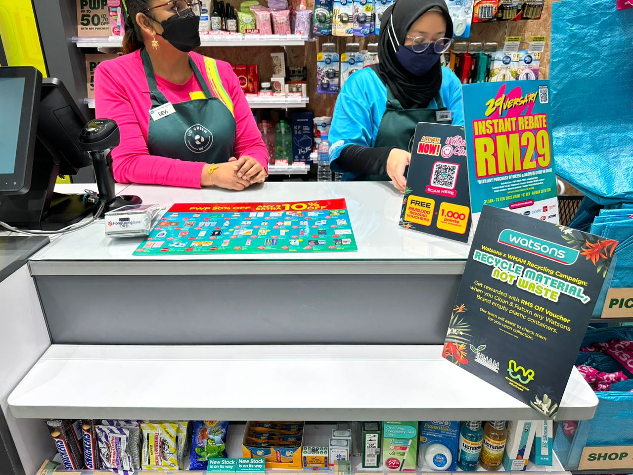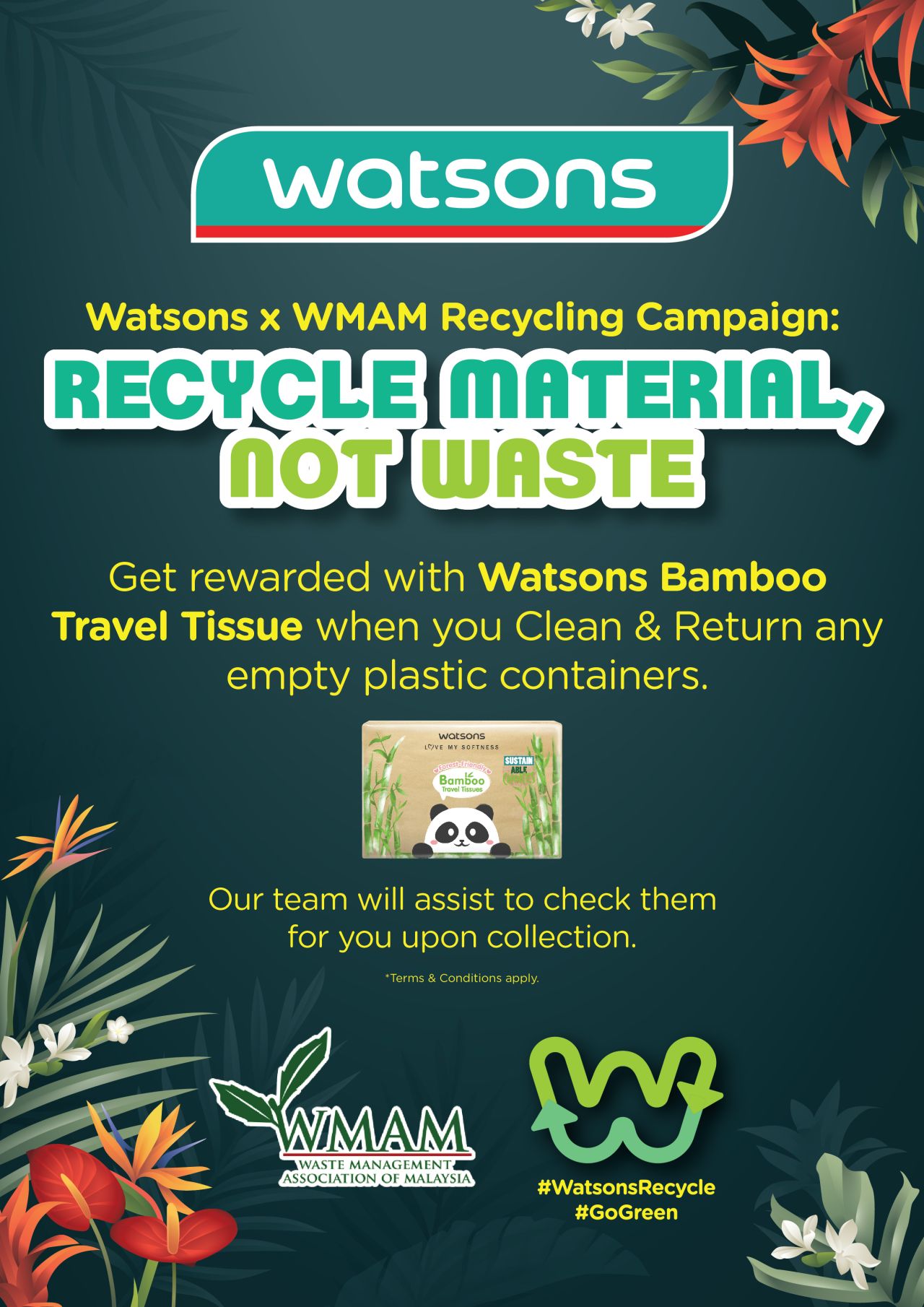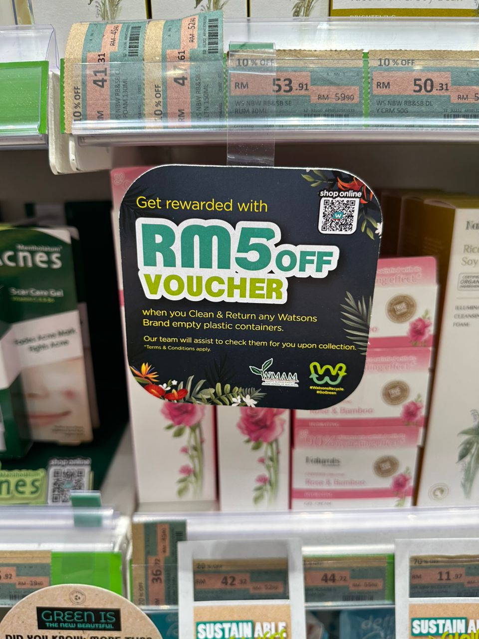 Clean and return any empty plastic containers will get rewarded with RM 5 OFF voucher. Find the T & C at https://www.watsons.com.my/tnc-recycle-material-not-waste